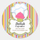 © 2010 Socialite Designs. Whimsical cupcake sticker design. The image incorporates a cupcake, a baker's hat, a whimsical text banner and a colourful striped background. Just replace our template text with your own. A wonderful way to seal your bakery boxes