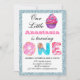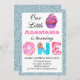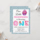 Bright and colourful light blue glitter sparkles first birthday invitation with a sweet and cute cupcake and doughnut and candy letters. Easily add your full name, and the date, time and address of the birthday party. Perfect for a sweet little princess turning one!