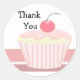 Picture a charming sticker adorned with a pink-frosted cupcake, crowned with a cherry and nestled in a pink liner. It's framed by a backdrop of delicate pink stripes, ready to be personalized with a heartfelt birthday or other message.