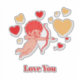 Vibrant cartoon cupid with wings, a red dress, and a bow flies across a heart-filled red backdrop. Perfect for Valentine, romance, and family-themed projects.