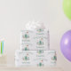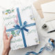 This custom Christmas wrapping paper features a cute nutcracker theme. An illustration of a Christmas tree is pictured with little gifts below it. A nutcracker toy soldier is standing on one side of it, with a sugar plum fairy fluttering above him. The Mouse King is printed on the other side. Little snowflakes fall around the tree. A sample greeting is printed above the image, with a name printed below in a whimsical green font. You can personalize the wrapping paper to include your own custom name or text.