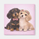 This charming illustration features an adorable dachshund couple sitting close together against a soft blush pink background. With their long bodies, floppy ears, and sweet expressions, this artwork captures a playful and romantic puppy-love vibe that dachshund fans adore.