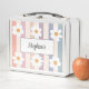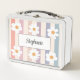 This cute lunch box features white daisies on a striped background in pastel colours. Easily customizable with your name. Great for Back to School or as a gift.