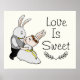 An inspirational saying about love "Love is Sweet" stands next to an adorable, handmade illustration of two rabbits dancing together in love. A sweet poster to celebrate the love that occurs between two people - and sometimes two bunnies. The perfect wedding or anniversary gift, or just a cute item to decorate your home.