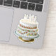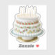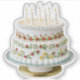 Celebrate in style with this cute cut-out birthday cake shaped sticker. The delicious looking cake has two tiers, with decorative piped icing patterns and colourful red and yellow flowers. The round birthday cake is pictured on a stand, and has lit candles on top.