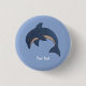 This round pin back button is a light blue colour with a cute deep blue sparkling look jumping dolphin with a white stomach and black and white swirl eye. Customize your text with the template.