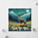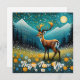 Cute deer standing on a flower meadow with mountain and pine trees background at night. Personalize it by changing the image and name.