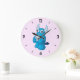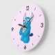 Creepy cute kids clock with a blue cartoon demon with kawaii skull and crazy look in pastel pink and blue.
