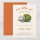 Adorable baby shower invitation with an illustration of a baby dinosaur or baby dragon about to hatch. Great for gender neutral baby showers since the colors are neutral green, orange and grey. Illustrated and designed by Patricia Alvarez.