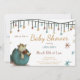 Cute green neutral baby shower invitation with an illustration of a dinosaur hatching from a green egg. At the top of the invitation there are some strings of stars in brown, green and yellow colors. Personalize all the information with your own.