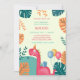Cute Girls Dinosaur Birthday Party Invitation for a dino themed birthday celebration. An adorable dinosaur with a colourful leaves background, a pink dinosaur with a party hat and balloons. Great for any age.