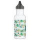 Cool, personalized dinosaur water bottle features a pattern of cute Tyrannosaurus (T rex), Triceratops, tropical monstera leaves, palm trees, volcano, bones, and "Roar!" text on a light blue background. Perfect for dino loving kids, back to school, sports and summer fun. Original artwork KL Stock