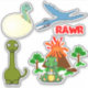 A sheet of 6 clear peel off stickers comprising of a Dino hatchling breaking out of an egg; a baby green dinosaur standing looking at you, a blue flying dinosaur and an adorable gaming Dino sitting in front of an island volcano that is erupting in the background. These are ideal for little boys that love their games and the fantasy of a civilization from centuries ago.