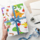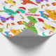 A cute cartoon Dinosaur Christmas wrapping paper featuring numerous colourful cartoon dinosaurs such as T rex - Tyrannosaurus Rex, Pterodactyl and Triceratops as well as decorated fir trees, candy canes and wrapped gifts . A fun xmas paper to wrap the holiday season presents for young babies and children. Perfect for dinosaur loving kids. Bright and fun. Personalize with the child's name in a Christmas font to make this extra special gift wrap.