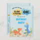 Dinosaurs are playing in the grass tossing a bone back and forth on front and playing among the palm trees on back of this cute 1st Birthday Party design. Simply add your details to complete this memorable occasion design.