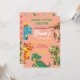 This cheerful design features a soft coral/peach background decorated with a playful cast of colorful, cartoon dinosaurs (including a T-Rex, Triceratops, and Pterodactyl) peeking in from all sides.