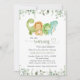 Invite friends and family in style and set the tone for your special day with this charming baby shower invitation. Design features dinosaurs (brontosaurus, triceratops, tyrannosaurus rex) and greenery on white background.