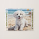 Cute jigsaw puzzle featuring an adorable white dog Great Pyrenees puppy on the beach. Makes a cute personalized stocking stuffer or birthday gift for kids and all the dog lovers. Comes with a cardboard carry-case with a puzzle image printed on the lid! Easily personalize the text or leave it blank. - Kate Eden Art