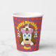 A cute dog with a pink bow and purple polka dots with big brown floppy ears and big blue eyes and a waggy tail and smaller dogs in the background with red bows and a red heart background makes up these fun paper cups. Customizable so you can add your own text and change the background colour. Say Happy Birthday with this adorable design! Goes great with our matching paper plates and party hats.