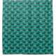 A shower curtain designed with a repeating pattern featuring a cute smiling doggy with floppy ears and a dog bone. Green background.