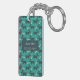 An acrylic keychain designed with a repeating pattern featuring a cute smiling doggy with floppy ears and a dog bone. Green background. Personalize with your name on the front and your name and phone number on the back.