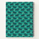 A spiral notebook designed with a repeating pattern featuring a cute smiling doggy with floppy ears and a dog bone. Green background.