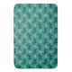 A bath mat designed with a repeating pattern featuring a cute smiling doggy with floppy ears and a dog bone. Green background.
