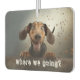 "Where we going?" text over a cute dog photo (can be changed to your dog) on a fun air freshener. An affordable gift for family, friends or create for yourself, they are double-sided and available in different shapes and several amazing long lasting, odour eliminating scents.