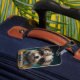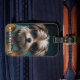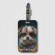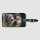"Where we going?" text over a cute dog photo (can be changed to your dog) on a luggage tag that features a business card slot on the back.
