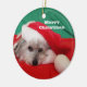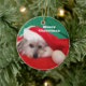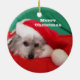 This dog Christmas ornament in red and green features a cute dog resting while wearing a Santa hat. An adorable addition to the Christmas tree of any dog lover. Cute dog design appears on both sides. Copyright ornamentsbyhenis