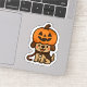 Cute dog with a jack-o-lantern on his head for halloween.