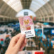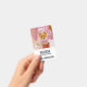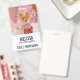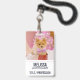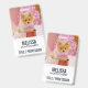 Name badge with an adorable Christmas dog wearing a cute pink plaid bow tie. This tiny little pet is sitting inside a whimsical hat box. A white tree decorated with pink lights in the background. The lights are blurred giving it a magical bokeh effect. Darling Christmas themed photograph. Perfect for dog lovers.