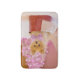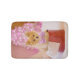 Bath mat with an adorable Christmas dog wearing a cute pink plaid bow tie. This tiny little pet is sitting inside a whimsical hat box. A white tree decorated with pink lights in the background. The lights are blurred giving it a magical bokeh effect. Darling Christmas themed photograph. Perfect for dog lovers.
