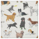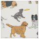 Fabric for dog lovers, featuring illustrations of golden retrievers, border collies, Jack Russell terriers, spaniels, basset hounds, beagles, Dalmatians, golden doodles, Labrador retrievers, and mixed breeds.