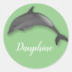 Cute grey dolphin - add a name now . It comes in sage green solid colour background. You can change the colour now . Round stickers for dolphin lovers / for anyone whose name is related to dolphins /sea /summer . Like Dauphine / Delphine /Aqualine . From the store of lumirala .