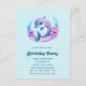 Birthday party invitation postcard with an adorable illustration. A blue and purple dolphin surrounded by pretty underwater florals.