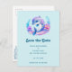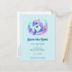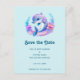 Save the date postcard with an adorable illustration. A blue and purple dolphin surrounded by pretty underwater florals.