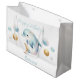 Gift bag with a cute blue and gold dolphin surrounded by water bubbles. You can customize it by changing all the texts. White background. On the back side, a pattern of colourful bubbles.