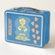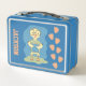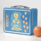 Gender neutral light blue lunchbox with an adorable yellow duck wearing big eyeglasses and holding a book . Orange duck footprints are shown on the right . Personalize it with the child's name using the template .