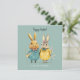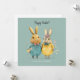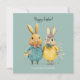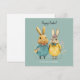 Cute Easter bunny couple holiday card. Wonderful spring colours in yellow and green / blue tones, a couple of super cute Easter bunnies in fancy clothes carrying eggs and spring flowers. Personalized text with a lovely trendy script.