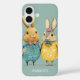 Cute Easter bunny couple iPhone 16 case. Wonderful spring colours in yellow and green / blue tones, a couple of super cute Easter bunnies in fancy clothes carrying eggs and spring flowers. Personalized text with a lovely trendy script.