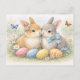 This heartwarming watercolor postcard features an adorable pair of bunnies nestled together among pastel Easter eggs and delicate spring flowers. Soft butterflies and a gentle background create a dreamy, romantic atmosphere, while the tender interaction between the rabbits adds a sense of love and warmth.