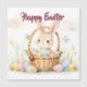 A charming Easter illustration featuring a cute bunny sitting in a woven basket surrounded by pastel-colored eggs and spring flowers. The soft watercolor style creates a warm, joyful atmosphere perfect for Easter greetings.