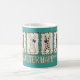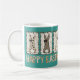 This cute teal Easter mug features cute coquette bunnies with animal print and checkerboard patterns, wearing cute hand-drawn brown bows in shades of brown and tan. Happy Easter is printed in playful type and coordinating colors underneath on both sides of the mug. The bunnies are posing against a color block of teal.