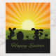 Sunny Easter illustration featuring 2 cute cartoon rabbits painting an Easter egg on a nature background.