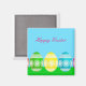 Beautiful and cute Easter design of multi-colored, decorated green, blue and yellow Easter eggs motif against a powder blue background, reminiscent of a clear, blue Spring sky.