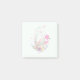 Small square post-it notes with a cute watercolor illustration of an egg sitting inside a wicker basket. Decorated with ribbons, bows, flowers and little hearts too. A pink flamingo and white bunny rabbit stand on either side watching over the precious cargo. A white semi-transparent layer placed over top to give the image a faded look so you can write on top.