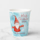 Create unique personalized Christmas paper cups for your family party with an elegant design that features a Merry Christmas saying, cheerful gnome in red and text templates for the year and Family name. These light blue and red paper cups with snowy pattern are perfect for winter holidays.