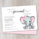 A cute baby girl shower invitation featuring "A Sweet Little Peanut Is On Her Way" in soft grey typography and a stylish swash script and a pastel pink watercolor of a baby girl elephant. Add the mother's name and shower details in simple modern grey typography.