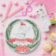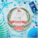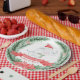 This cute White Elephant paper plate design features a watercolor elephant peeking out from a Christmas wreath. The words "Baby's First" are written in white on a red ribbon banner with Christmas directly below.